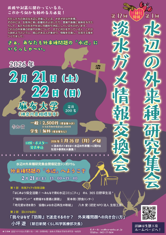 【淡水ガメ情報交換会】の発表、【水辺の外来種研究集会】の発表、どちらも同時に募集します。